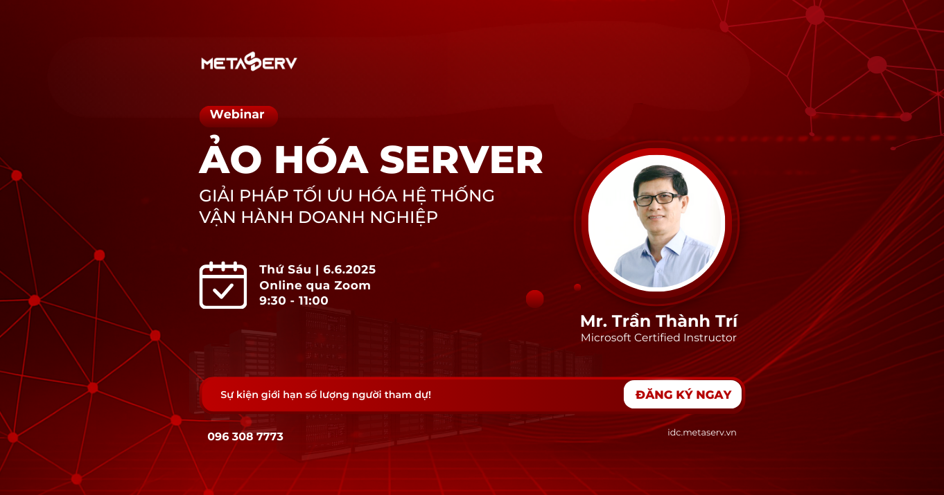 Nhằm giúp doanh nghiệp HIỂU ĐÚNG - LÀM ĐÚNG về ảo hóa server và theo kịp bối cảnh thị trường, METASERV tổ chức Webinar: “ẢO HÓA SERVER: GIẢI PHÁP TỐI ƯU HÓA HỆ THỐNG VẬN HÀNH DOANH NGHIỆP”.